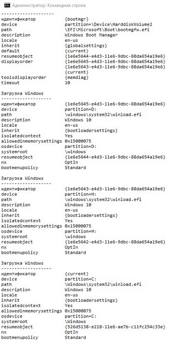Проверяем хранилище загрузки командой bcdedit