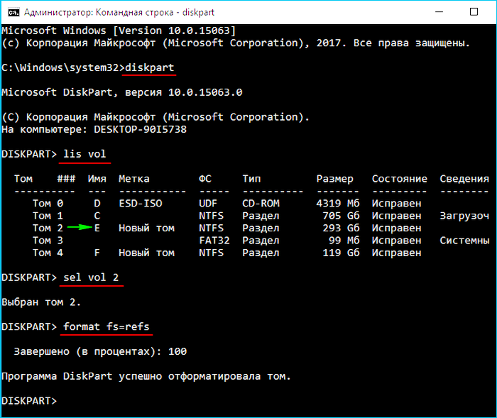 Форматирование раздела в REFS осуществляется только из проводника Windows 10, а также в командной строке.