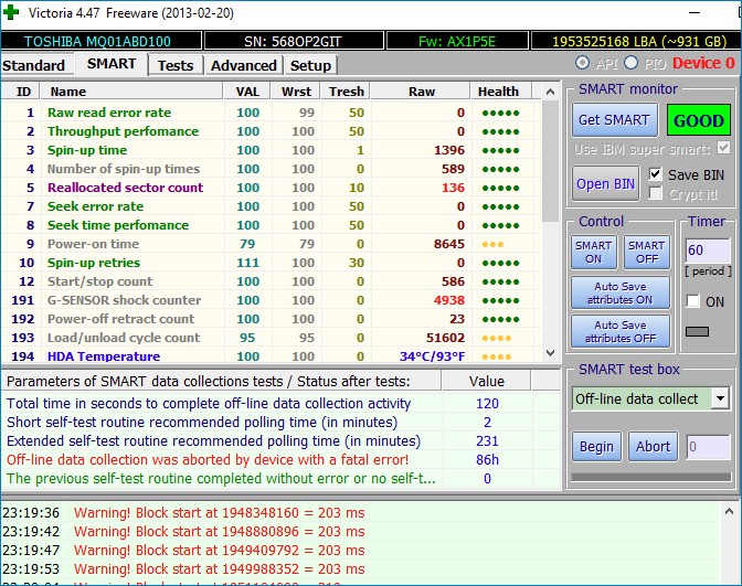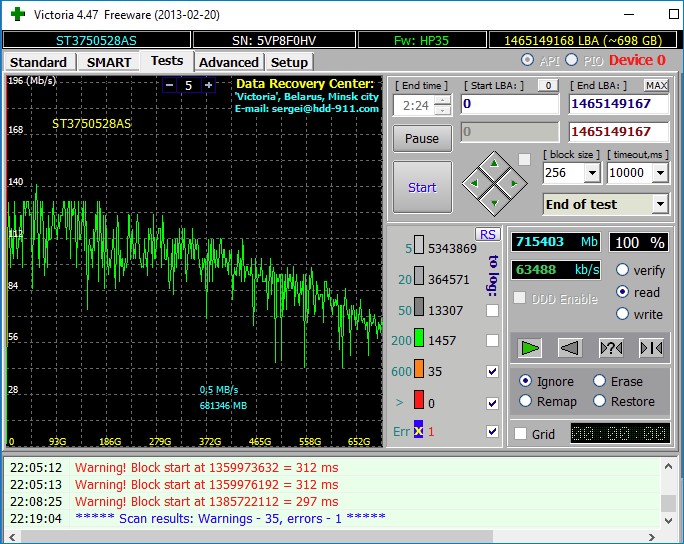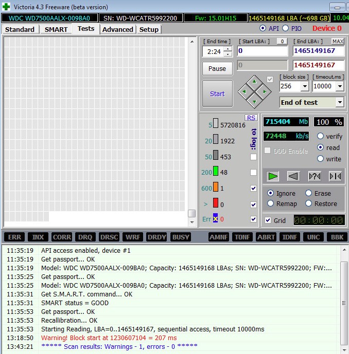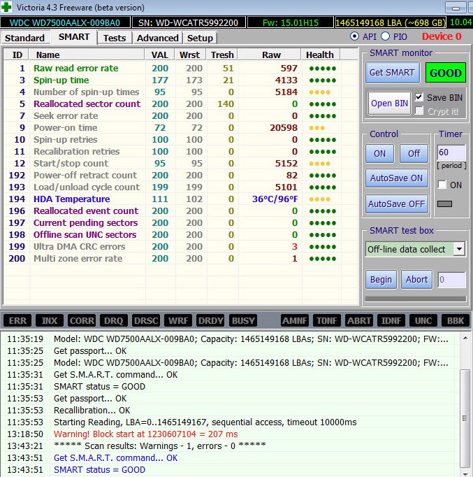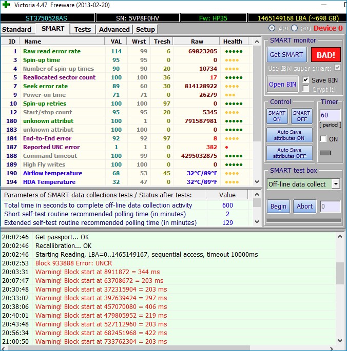 Здравствуйте. У меня жесткий диск Seagate на 750 Гб, отработал 6 лет. Пару недель назад при включении компьютера SMART начал жаловаться - "status bad backup and replace". После теста через викторию (в фоновом режиме) следующие результаты: