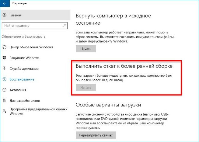 «Восстановление» —>«Выполнить откат к более ранней сборке»