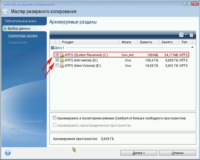 Так же можно вручную выбрать Резервное копирование нужных нам дисков и разделов
