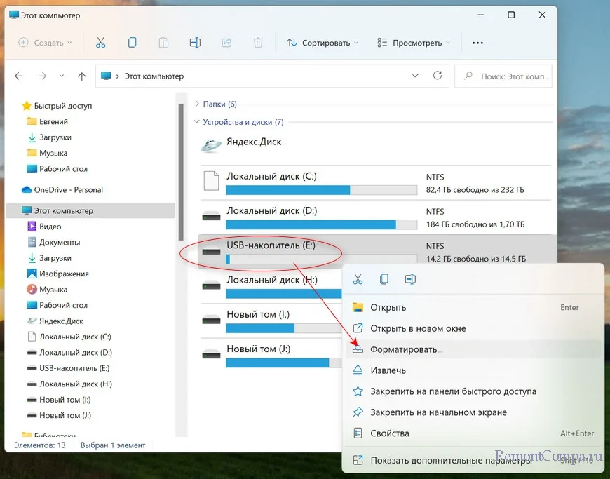 1. Нажав ПКМ на носителе в проводнике и в контекстном меню выбрав пункт "Форматирование".