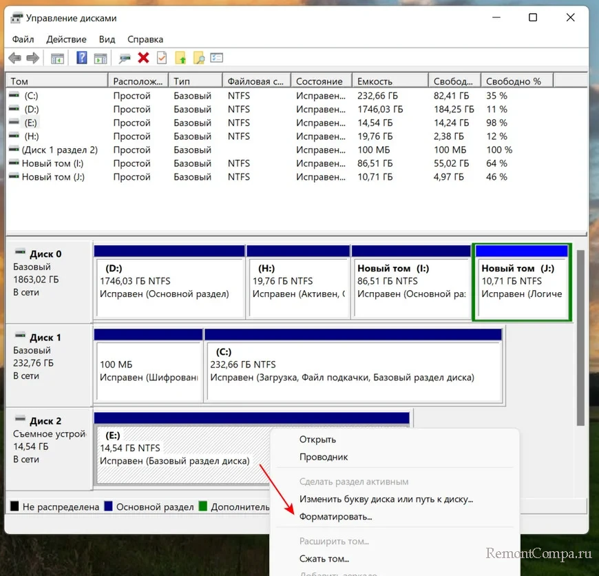 2. С помощью меню "Управление дисками". В таком случае необходимо выбрать нужный раздел и нажав ПКМ выбрать тип форматирования.