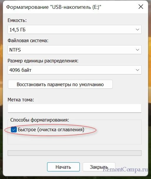 Обратите внимание на следующее окно, в нём предлагается выбрать Способ форматирования.