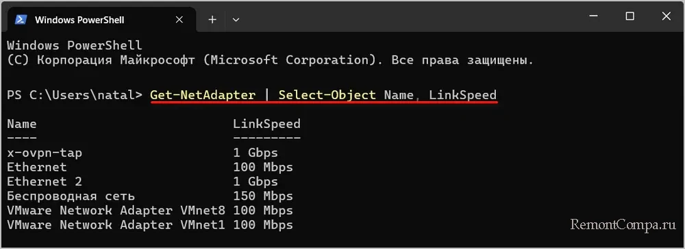 Get-NetAdapter | Select-Object Name, LinkSpeedВ ответ получаем перечень всех сетевых адаптеров – Ethernet, Wi-Fi, виртуальных – с указанием пропускной способности каждого.
