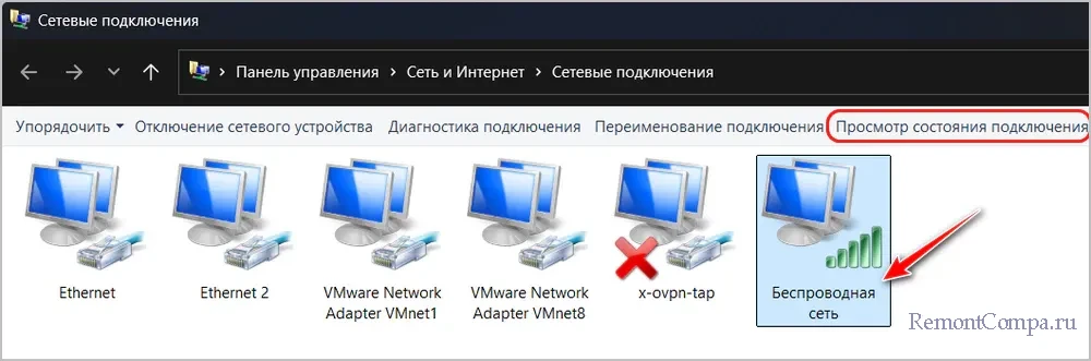 ncpa.cplОткроются сетевые подключения в формате панели управления. Здесь будут отображены все наши сетевые адаптеры – проводной сети Ethernet, беспроводной Wi-Fi, а также виртуальные, создаваемые некоторыми программами. Выбираем поочерёдно из сетевых адаптеров физические и либо делаем на них двойной клик, либо отмечаем кликом и жмём вверху «Просмотр состояния подключения».