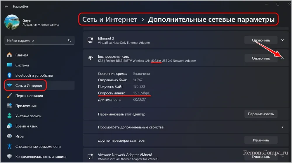 Поддерживаемый беспроводным адаптером стандарт Wi-Fi отображается в его свойствах в Windows. В Windows 11 стандарт указывается там же, где и пропускная способность адаптера - в приложении «Параметры» по пути: