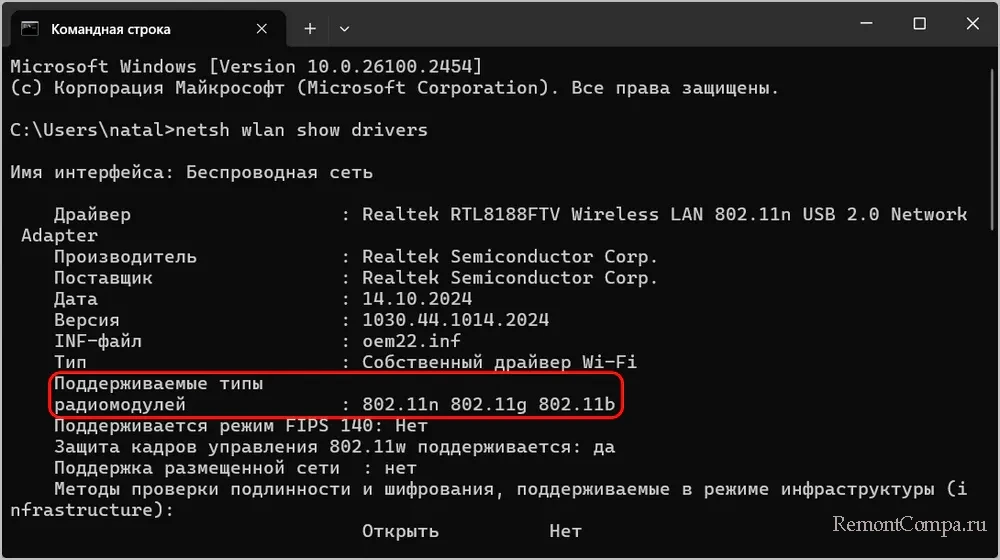 netsh wlan show driversВ числе полученных в ответ сведений будет техническая информация о беспроводных адаптерах с указанием поддерживаемых ими стандартов Wi-Fi в графе «Поддерживаемые типы радиомодулей».