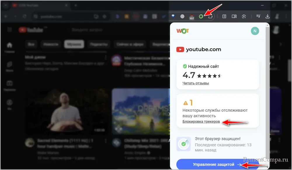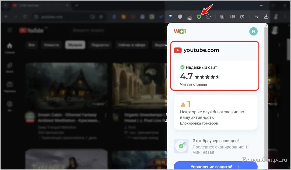 Панель расширения WOT на сайтах также содержит виджет обнаруженных трекеров и кнопку «Управление защитой» для настройки функций WOT.