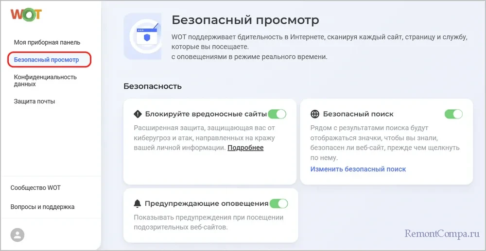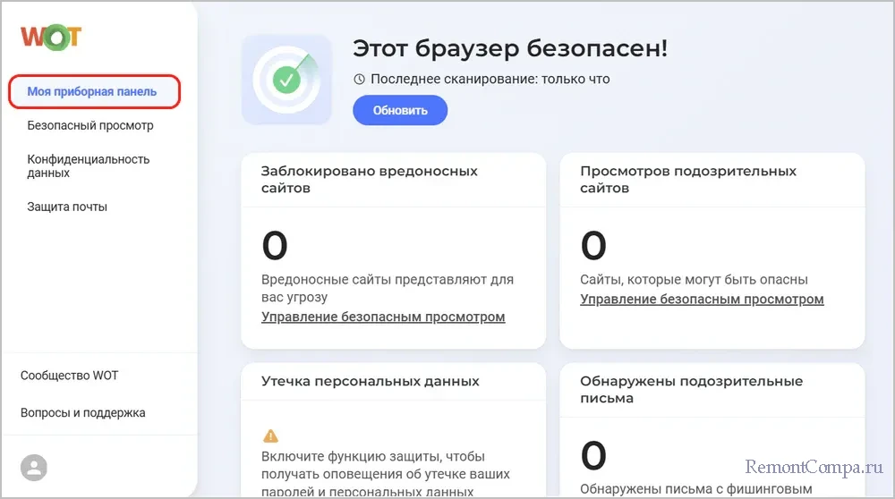 Настройки WOT – это отдельная страница, их главный раздел «Моя приборная панель» содержит виджеты блокировки вредоносных сайтов, наших просмотров подозрительных сайтов, обнаружения подозрительных писем электронной почты и заблокированных трекеров.
