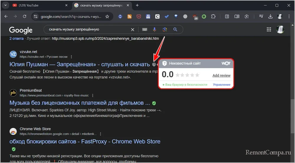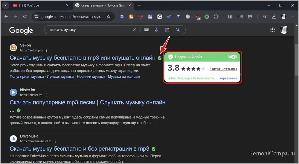 Но куда более интересен WOT тем, что отображает репутацию сайтов в поисковых системах. После установки расширения каждый сайт в поисковой выдаче будет иметь маркер надёжности WOT. Поддерживаются поисковики Google, Яндекс, Bing, Yahoo, DuckDuckGo и другие. Надёжные сайты обозначаются зелёным маркером со значком галочки.