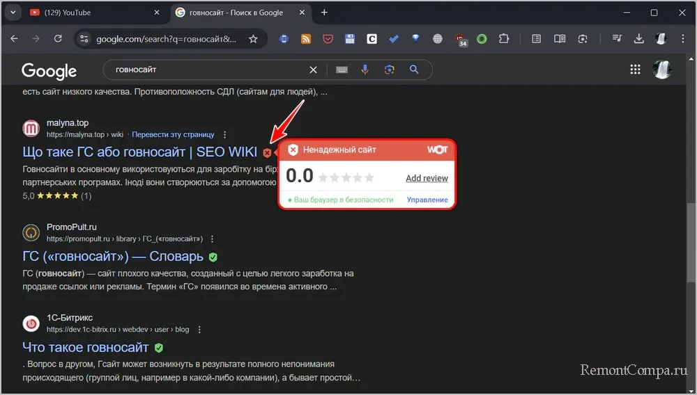 При подведении курсора к маркеру появится небольшая панелька WOT с отображением рейтинга сайта и отсылкой на пользовательские отзывы о нём на сайте WOT. Любой из нас, друзья, может оставить на сайте WOT отзыв о том или ином сайте в Интернете. Возможность являет собой непаханое поле для альтруистов: если знаете, что сайт причастен к скаму, фишингу, вредоносному ПО, поставляет недостоверную информацию, любым иным образом несёт общественную угрозу, пишите об этом в отзывах WOT, возможно, ваша информация убережёт кого-то от проблем. О хороших годных сайтах можно оставлять положительные отзывы.