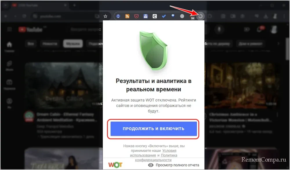 После установки расширения WOT в используемый браузер на панели этого расширения необходимо включить его, чтобы защита активировалась.