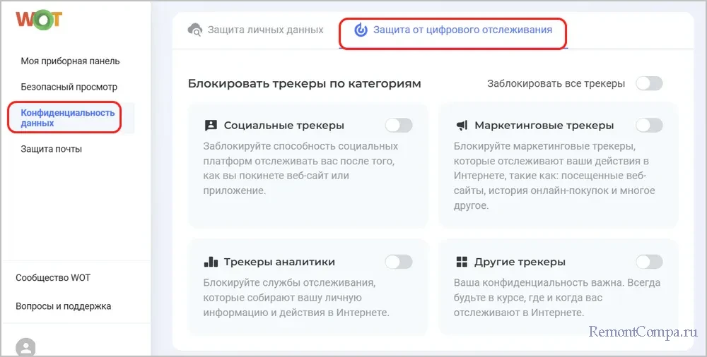 Также предлагается блокировка трекеров отдельно для их категорий.
