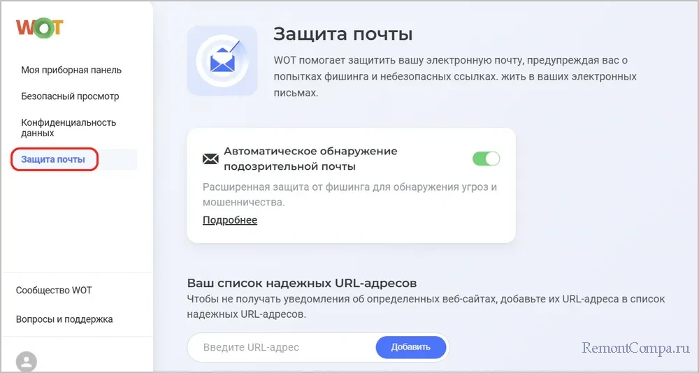 Раздел «Защита почты» позволяет включить/отключить функцию WOT по обнаружению подозрительной почты в наших почтовых веб-аккаунтах.