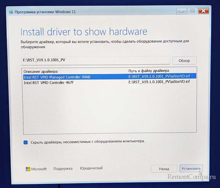 Подсоединяем к ноутбуку второй USB-накопитель с папкой «Intel Rapid Storage Technology и драйвером IRST 19.1.0.1001 Revision: 09/17/2021» и жмём на кнопку «Загрузить драйвер».