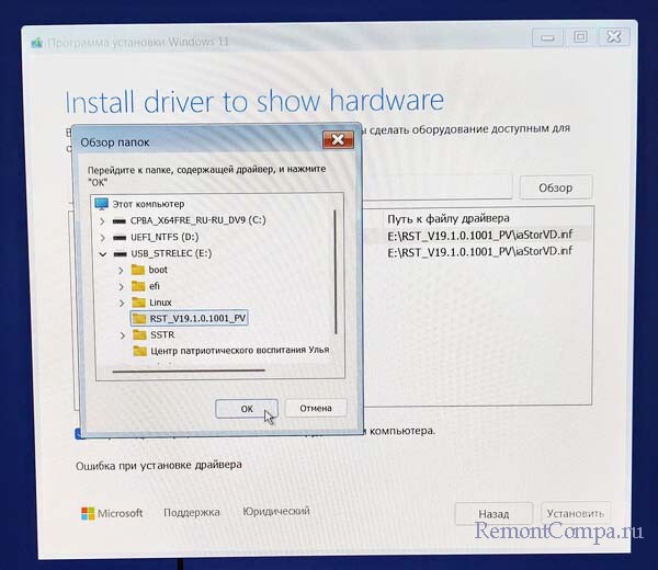 В проводнике находим папку с драйверами RST, выделяем её и жмём ОК.