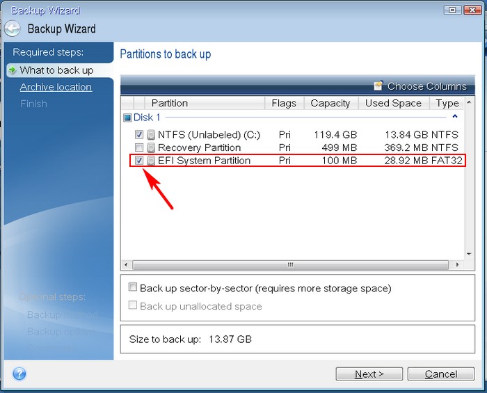 Самое главное в программе Acronis True Image 2015 выбрать нужные разделы для включения их в резервную копию. Обязательно нужно включить в бэкап диск (C:) с файлами операционной системы.