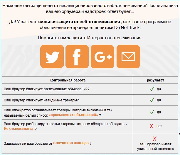 Например, уникальность настроек браузера снижает энтропию, делает вас более опознаваемыми в интернете. Для определения уровня хаотичности выдаваемой браузером информации специалисты EFF создали сервис Panopticlick (https://panopticlick.eff.org/), позволяющий определить вероятность отслеживание компьютера пользователя по оставляемым в интернете цифровым следам. Сервис предлагает пройти простой тест, в ходе которого будут проверены настройки обозревателя, отвечающие за обмен данными определенного типа, в основном связанные с трекинговыми технологиями.