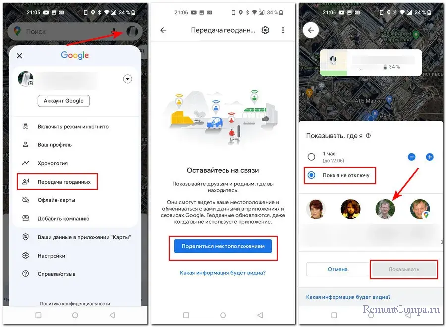 Отслеживать местоположение человека можно элементарно с помощью приложения Google Карты. На телефоне человека в меню приложения выбираем «Передача геоданных», далее – «Поделиться местоположением». Выбираем «Пока я не отключу». Выбираем контакт, которому будет отправлена ссылка отслеживания местоположения – самим себе. Жмём «Показывать».