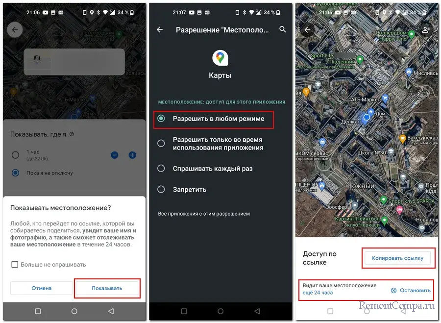 Подтверждаем показ местоположения. Разрешаем Google Картам доступ к местоположению в любом режиме. И получаем ту самую ссылку отслеживания местоположения. Но, друзья, таким образом местонахождение человека можно отслеживать только 24 часа. Т.е. нужно проделывать такие манипуляции в приложении Google Карты на телефоне отслеживаемого человека каждые сутки.