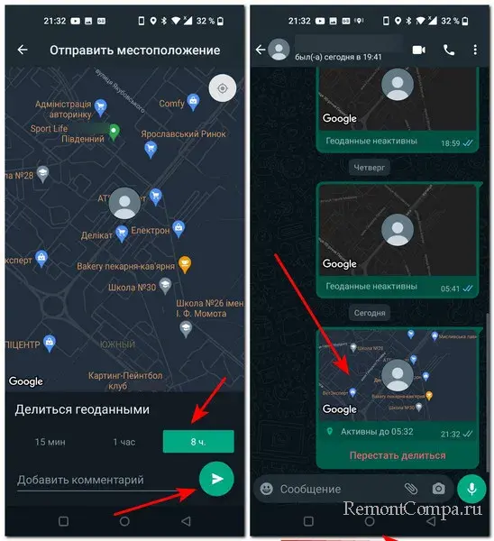 Выбираем время, на протяжении которого нам будут поступать сведения о геолокации. Максимальный период здесь только 8 часов. Отправляем себе ссылку на геолокацию. И отслеживаем перемещения человека на карте по ссылке в чате.