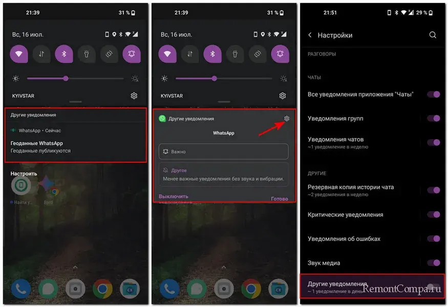 При отправке геолокации в шторке уведомлений Android будет висеть уведомление WhatsApp о публикации геоданных. Если нужно отключить это уведомление, делаем на нём долгий тап и отключаем «Другие уведомления».