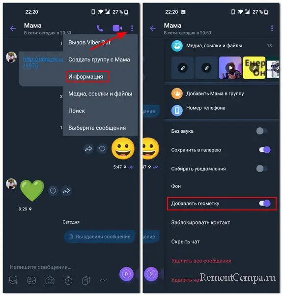 Интересная реализация определения местонахождения человека есть в мессенджере Viber. На телефоне в Viber-чате с человеком жмём меню, выбираем «Информация». Включаем «Добавлять геометку».
