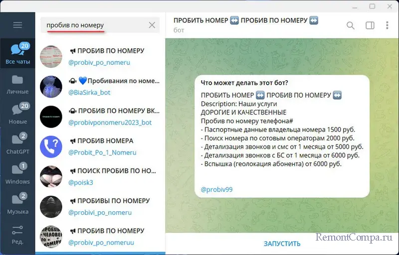 Выше мы упоминали о конторах, которые якобы по номеру телефона устанавливают конфиденциальные данные о человеке. В Интернете также можем найти сервисы, каналы или чат-боты в Телеграмме, которые предлагают за деньги определение местонахождения человека. Многие из таких контор предлагают комплексно услуги пробива по номеру телефона, которые включают данные о человеке, отслеживание его геолокации, детализацию звонков и пр.