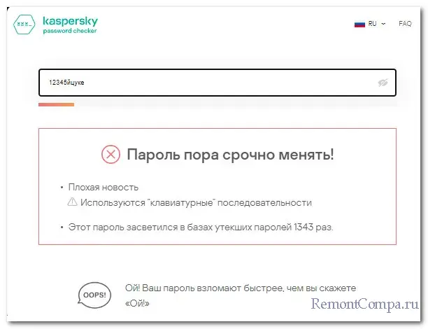 Проверяйте надёжность паролей с помощью сервисов наподобие Kaspersky Password Check. Этот сервис проверят пароли по базам утечек и анализирует, сколько времени потребуется для подбора пароля. По итогу проверки выносит вердикт: пароль хороший