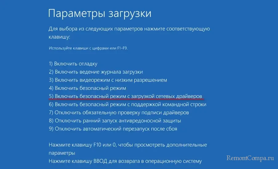 Далее выбираем безопасный режим с загрузкой сетевых драйверов. Выбираем его нажатием клавиши F5.