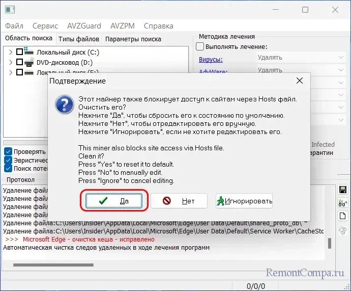 По итогу AV Block Remover предложит очистить файл Hosts. Соглашаемся и нажимаем «Да».