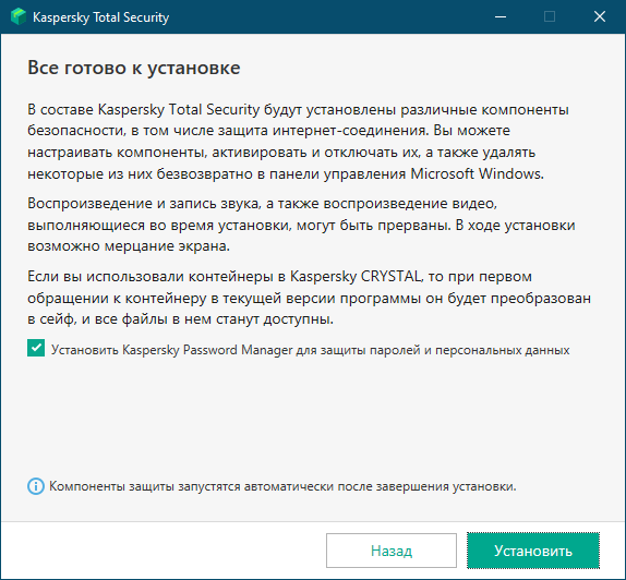 Эта программа представляет собой наиболее полный пакет компонентом защиты компьютера от всех известных и новых угроз. Kaspersky Total Security включает в себя многофункциональный, обеспечивающий защиту в режиме реального времени комплексный антивирус, персональный брандмауэр, родительский контроль, модули защиты от спама, фишинга, рекламного и потенциально небезопасного ПО, несанкционированного сбора данных, сетевых атак, программ-шифровальщиков и эксплойтов.