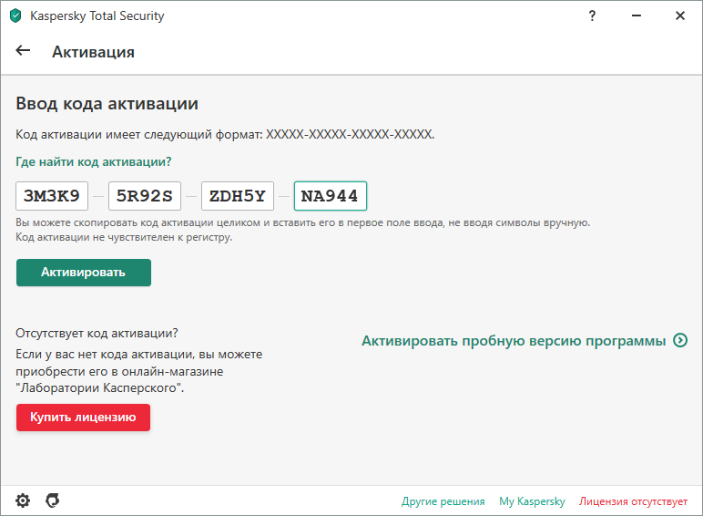 Всё просто: установив Kaspersky Total Security 2021 на свой компьютер (в процессе установки мастер может предложить инсталлировать ПО от Яндекса). По завершении установки откроется окно активации, введите в поле ключ: