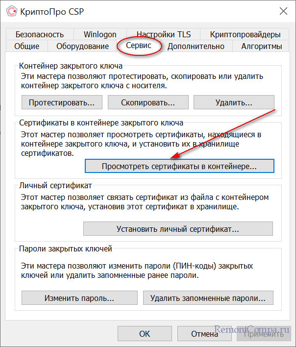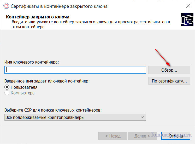 но информация о нём есть в контейнере закрытого ключа, который мы с вами установили в реестр.