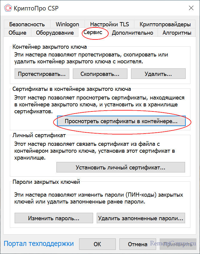 Запускаем программу КриптоПро. Сервис ->Посмотреть сертификаты в контейнере.