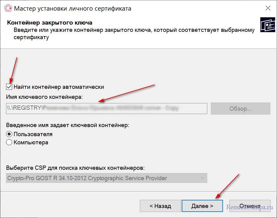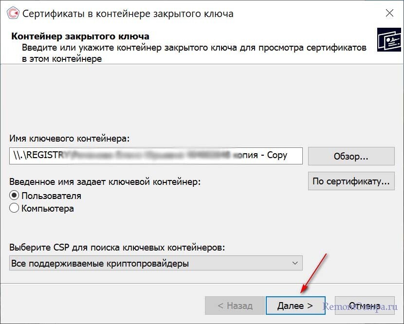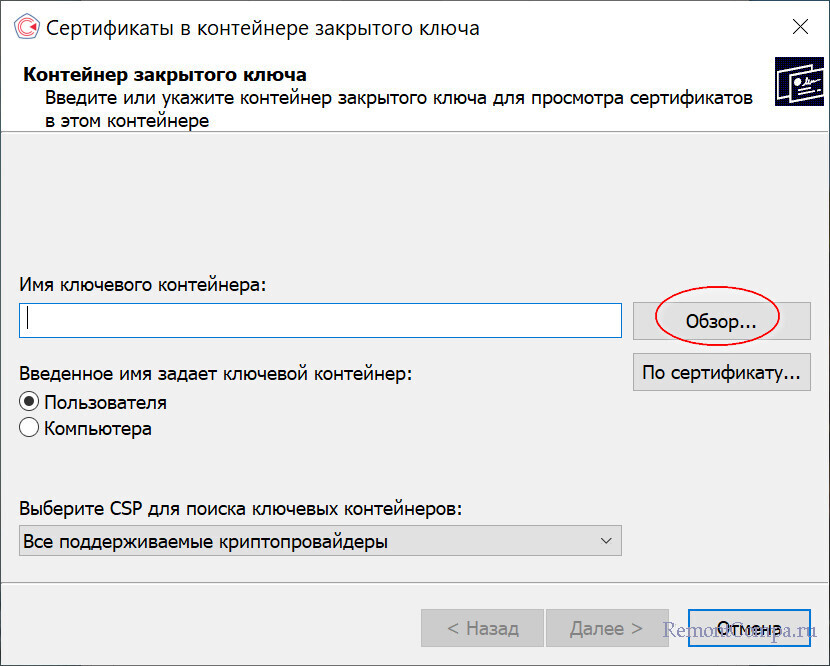 Введите или укажите контейнер закрытого ключа для просмотра сертификатов в этом контейнере.