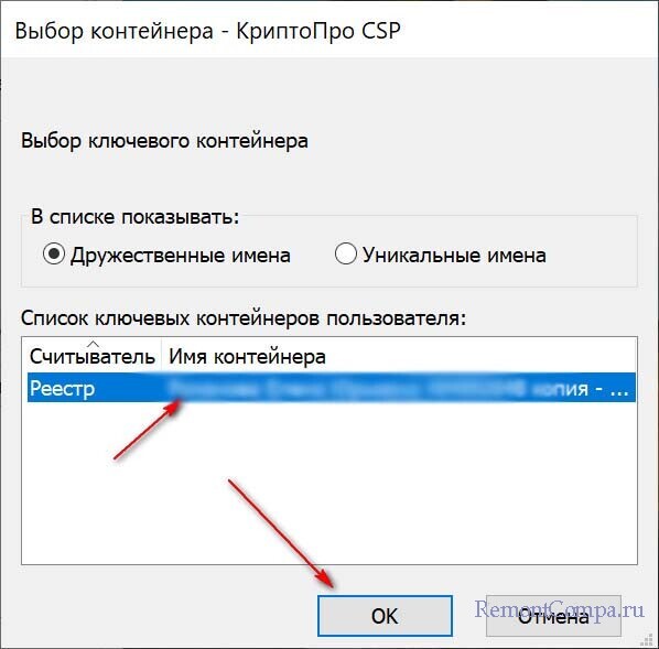 Видим ЭЦП скопированную нами в реестр, простыми словами, это и есть контейнер закрытого ключа с сертификатом открытого ключа. Выделяем её мышью и жмём ОК.