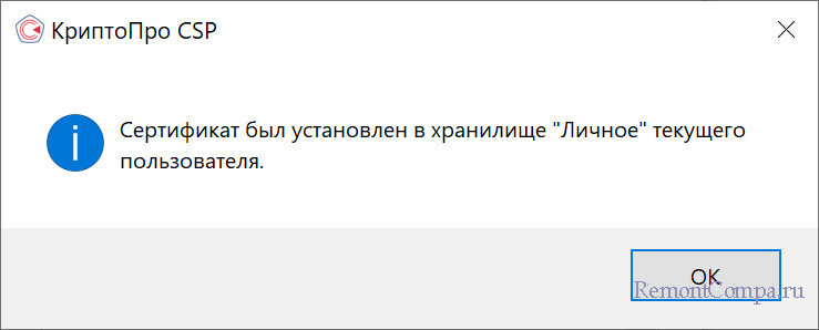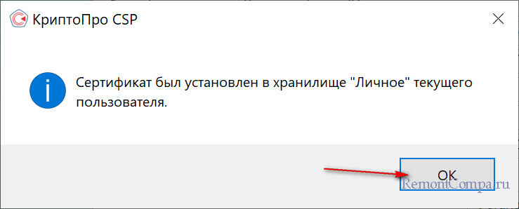 ОК. Квалифицированный сертификат электронной подписи установлен в хранилище "Личное".