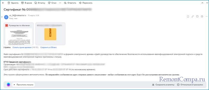 Квалифицированный сертификат в виде файла сертификата .cer на нашей почте.