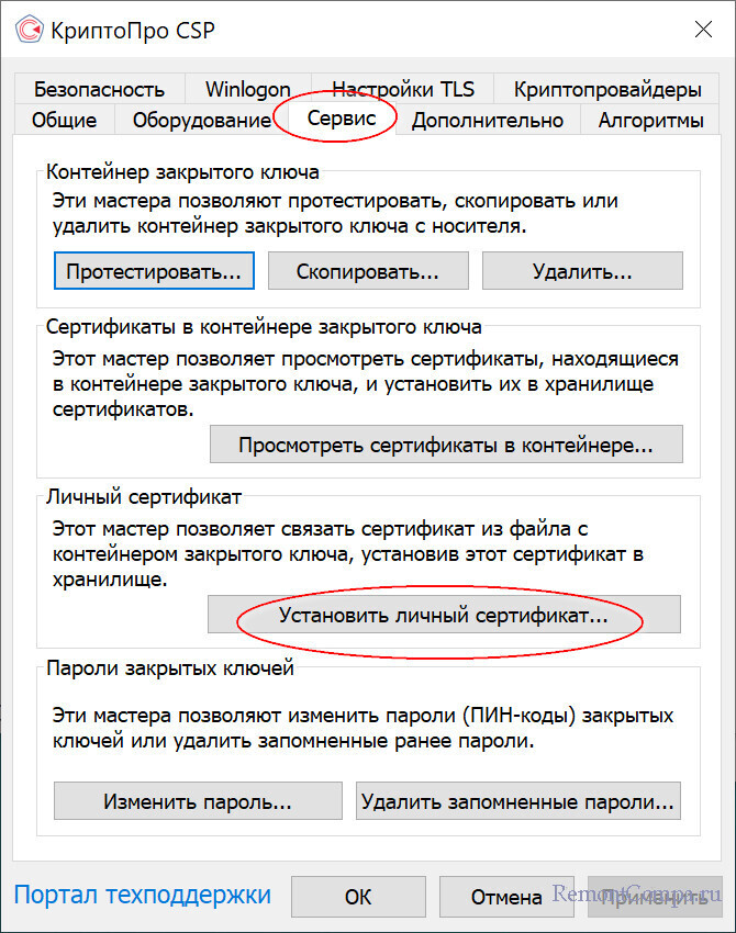 Устанавливаем его. Открываем программу КриптоПро. Сервис ->Установить личный сертификат.