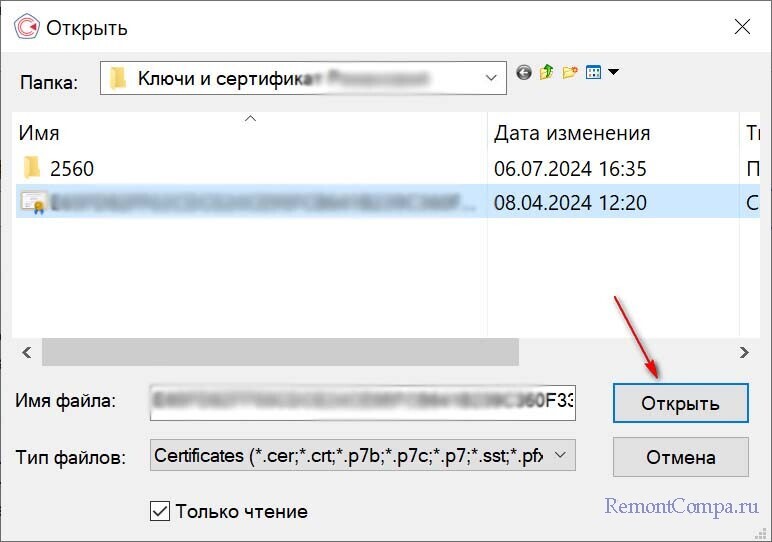 В открывшемся проводнике указываем файл сертификата с расширением .cer и жмём Открыть.