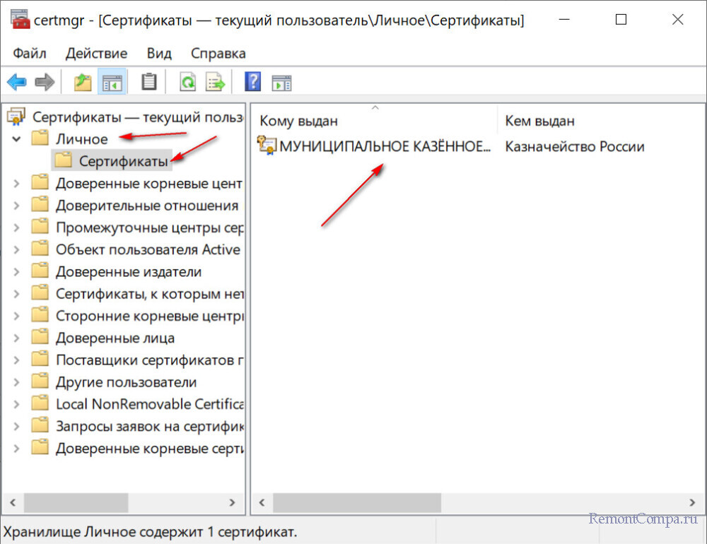 Пуск ->Выполнить, вводим certmgr.msc и видим, что в хранилище личных сертификатов мы с вами установили наш сертификат.