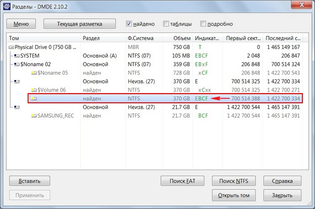 По объёму подходит второй найденный раздел, имеющий к тому же индикаторы BCF, выделяем его левой мышью и жмём на кнопку "Вставить"
