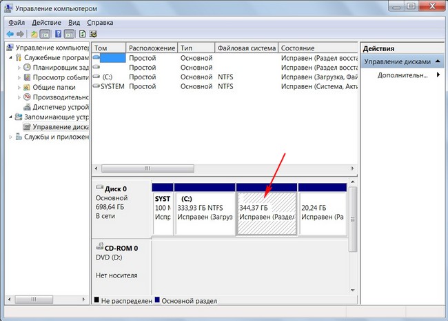 Появляется из небытия наш диск (D:), но почему-то без буквы.