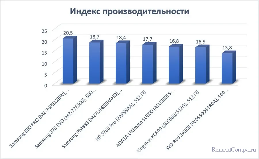 И в хвосте рейтинга по индексу производительности у нас WD Red SA500 500 Гб, накопитель от известного производителя HDD Western Digital. Позиционируется как накопитель для NAS-хранилищ, но имеет лишь немногим больший ресурс перезаписи данных, чем потребительские накопители – 350 TBW, чего нам хватит, чтобы в течение 5-ти лет каждый день перезаписывать по 196 Гб данных. Номинальный объём у накопителя 500 Гб. Флеш-память от SanDisk, контроллер Marvell 88SS1074, DRAM-буфер 4 Гб (DDR3L-1600).