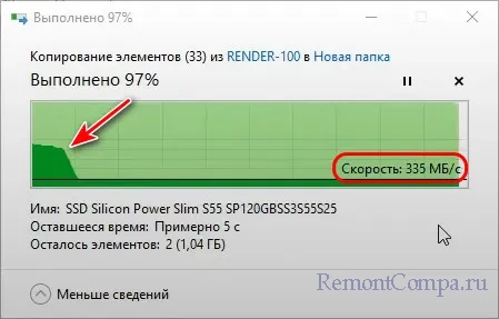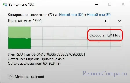 И мы, например, при копировании данных в проводнике Windows видим, как SSD NVMe эпатажно расправляются с этой задачей со скоростью 1.5-2 Гб/с. Это скорости в SLC-режиме.