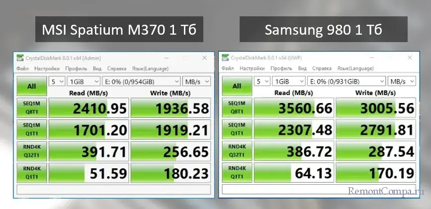 Хороший пример SSD NVMe без DRAM-буфера - Samsung 980. Ниже мы сравним его скорости со скоростями MSI Spatium M370 1 Тб.