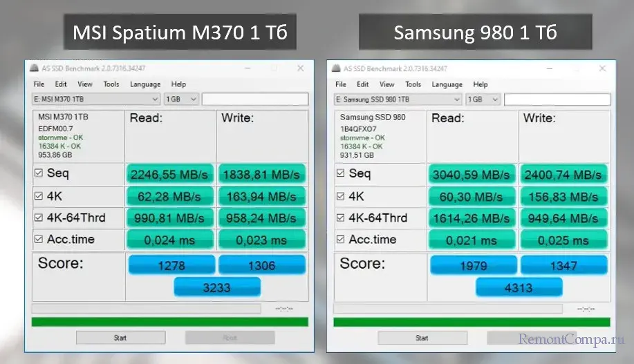 Ну и давайте сравним MSI Spatium M370 1 Тб с упомянутым выше Samsung 980 в синтетических тестах. В CrystalDiskMark в тестах последовательного чтения и записи данных SEQ1M Q8T1 и SEQ1M Q1T1 MSI Spatium M370 1 Тб безоговорочно проигрывает Samsung 980. У последнего заточенный на большие скорости работы контроллер, фирменная эффективная флеш-память Samsung, фирменная эффективная технология SLC-кэширования, сам SLC-кэш больше. В тестах рандомного чтения и записи RND4K Q32T1 и RND4K Q1T1 накопитель MSI Spatium M370 1 Тб в основном немного отстаёт от Samsung 980, где-то на уровне погрешности. А в тесте записи RND4K Q1T1 даже опережает Samsung 980.