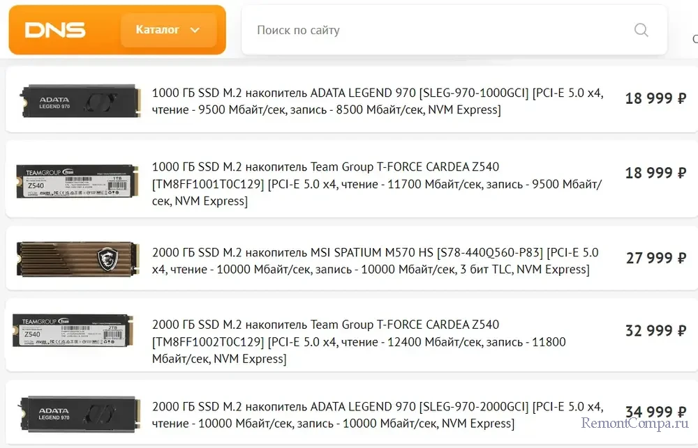 Стоят SSD PCI-E 5.0 на данный момент, друзья, немыслимых денег. Во-первых, как упоминалось, поставляются такие накопители пока что только с большим объёмом от 1 Тб. Стоят условно от 19 тыс. руб. на рынке России.
